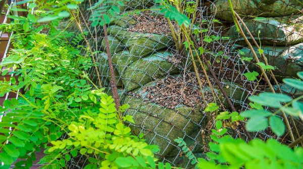 山上缺水就打井,虽然废了3眼,但剩下的7眼解决了浇灌问题;没有土就用绿植袋一层层码在满是乱石的山坡上。“绿植袋里装的是腐殖土、肥料和种子,上面再覆盖钢丝网避免滑落。”