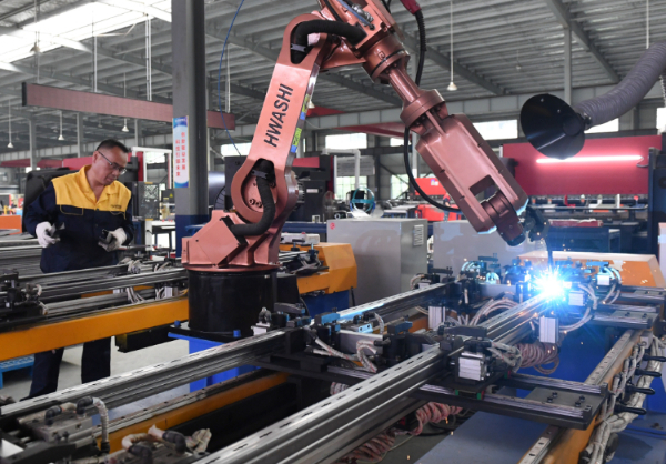 金虎集团工作人员正操作机器人焊制金属家具配件