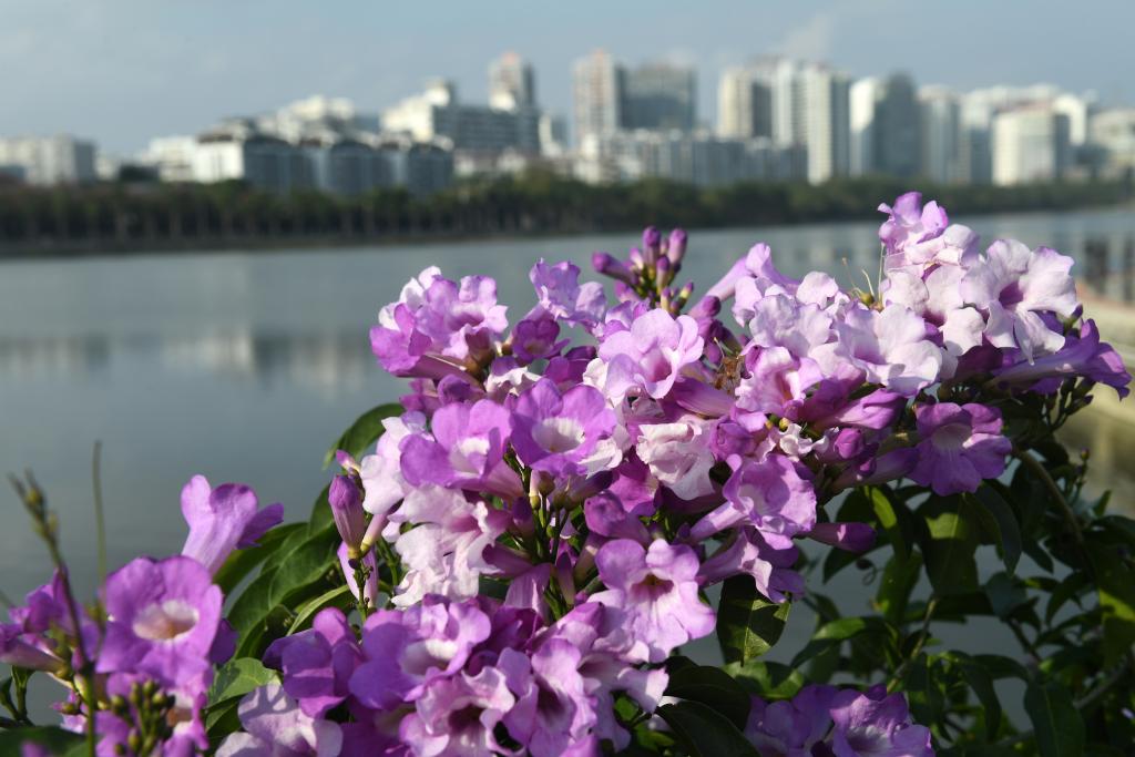 这是南宁市青秀山盛开的鲜花及附近建筑楼群(2026年4月12日摄)。