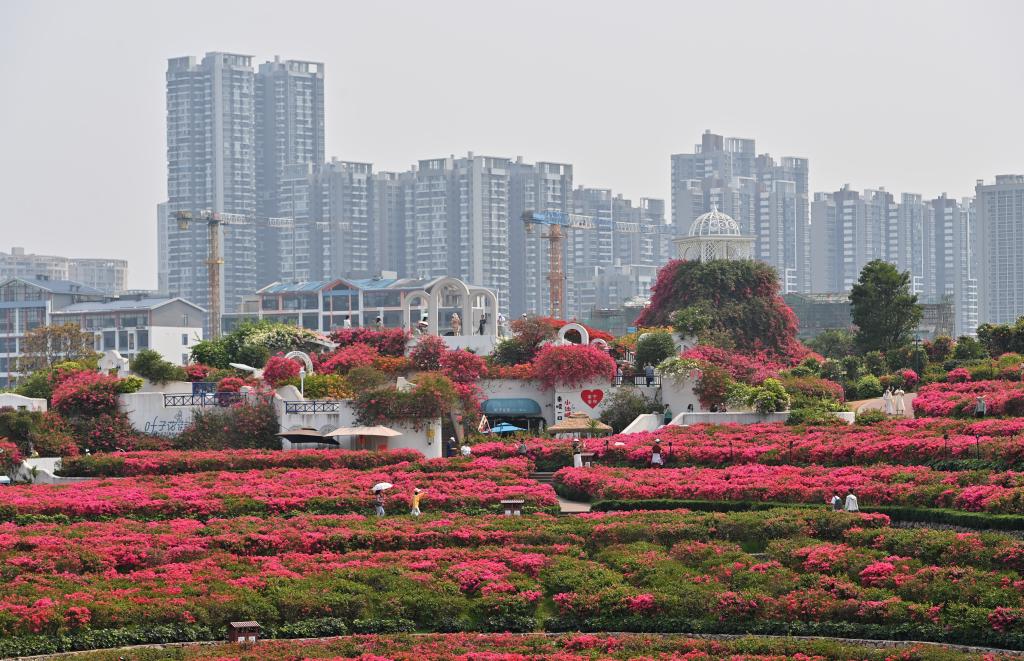 人们在南宁市青秀山欣赏盛开的鲜花(2026年4月12日摄)。
